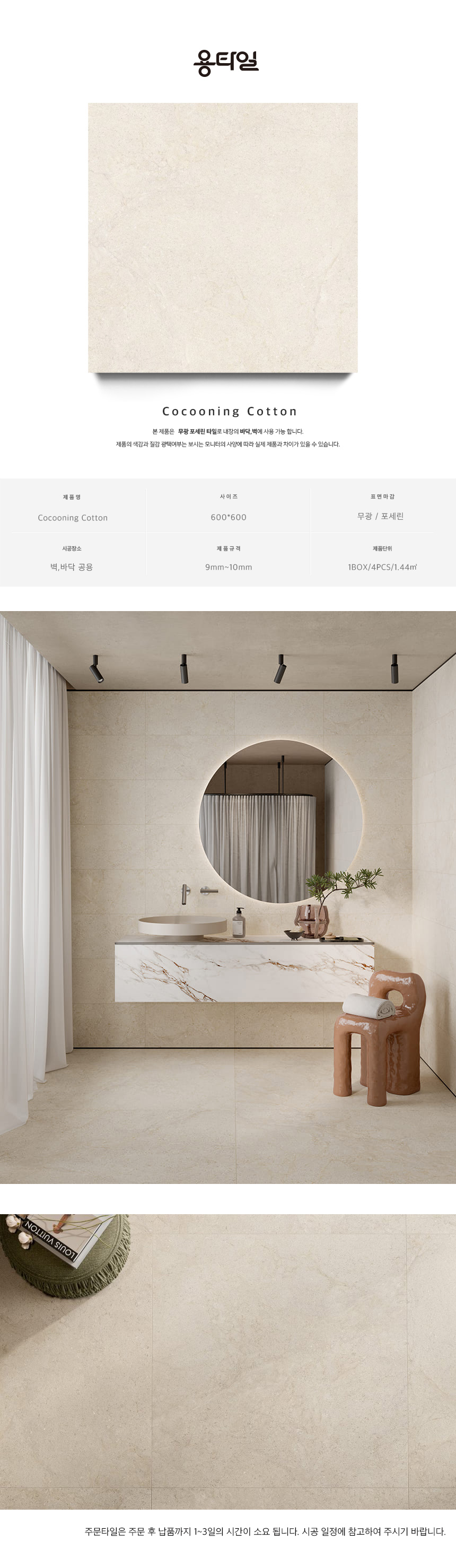 - 타일 특성상 같은 박스 에서도 무늬가 조금씩 다 다르며 (무늬나 질감등이 랜덤인 경우가 많습니다.)